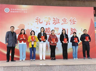 本报4月18日讯  “可爱的宋老师,我们对您的敬爱如圆周率般无穷无尽。”“亲爱的马老师,您亲切的眼神温暖着我们的心。”“尊敬的初老师,您就是我们心中最美的班主任”……4月17日下午,青岛实高附中“礼赞班主任 感恩引路人”班主任节闭幕式在学校操场举行,20位班主任在各班学生的祝福声和陪伴下,依次走上红毯,接过鲜花和感恩卡片,领取奖状,学校还为担任10年以上的班主任颁发荣誉证书,用一场特殊的仪式感恩班主任。