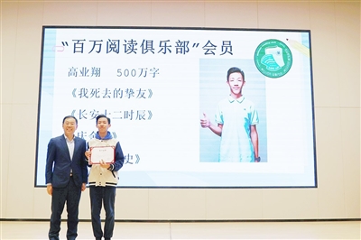 学校智慧学习中心义工学生获得勋章,首批十余名“百万阅读俱乐部”学生会员进行风采展示,第一季会员获得证书、奖品及勋章……在俱乐部里,读书既给学生们带来了丰富的知识,也带来了满满的成就感。记者注意到,登台领奖的高一年级会员中,高业翔同学已经阅读了《我死去的挚友》《长安十二时辰》《庆余年》《漫画中国史》等书籍,总阅读字数达到了500万字。