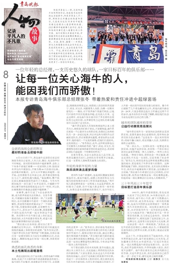 “我一直认为,一支球队首先一定要追求竞技层面,但抛开竞技层面,我觉得一个俱乐部应该对社会更多展现一种人文情怀,一种本土的文化底蕴,一种家乡情结,带给社会一种正能量,职业足球队不光是一支球队,它还承载了社会责任。”张冬认为,特别是青岛这样有着浓厚足球氛围的城市,更是寄托了外界非常大的期待。这种期待超越了球队、球迷的层面,尤其在队伍降级9年后,再次在中超赛场和大家见面,这份激动不言而喻。“俱乐部今年希望打出自己的特色,打好每场比赛,虽然说不敢保证每一场比赛都去赢,但起码每一场比赛都会打出青岛人的精神来。”
