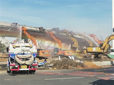 6日上午8时许,在50台冲击锤机同时作业发出的巨大轰鸣声中,雁山立交桥拆除工作正式开始。受拆除封闭施工影响,雁山立交桥周围的山东路、海伦路、安达路等道路出行一定程度拥堵情况。当天上午7时许,记者步行前往现场采访看见,所有挖机都已就位,在立交桥两侧有序排列,炮锤全都对准了桥体。工作人员告诉记者,由于雁山立交桥所处位置周边老旧小区较多,无法实施爆破拆除,为最大程度减轻施工对道路交通和居民生活的影响,施工方调来了50台挖机,通过同时作业方式尽快完成拆除工作。为避免拆除过程中的灰尘影响空气质量,施工方还提前调集来了26台洒水车不间断进行洒水除尘作业,并在施工路段铺设了钢板和40厘米厚的风化砂,设置缓冲带,保护地下管线。得知拆除消息的市民,早早来到施工现场,周围高点都被他们“占据”。大家拿着手机,记录着拆除过程。