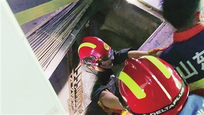 救援人员到场后了解到,受伤男子是一家饭店的员工,经过楼梯时未注意到空隙,一脚踩空摔下10米受伤。救援人员观察后发现,缝隙宽约80厘米、长约1米,空间十分狭小。伤者右腿受伤不能动弹。救援人员决定采用索降加拉梯辅助吊升的方法施救。救援人员在洞口搭设防坠支架,一名救援人员索降到男子身边观察。随后赶到的医护人员攀爬拉梯下到男子身边,将他受伤的右腿固定住。救援人员利用绳索、板带将男子腰部固定,借助梯子向上托举。地面救援人员利用双绳吊升,将男子移至地面并移交给医护人员。