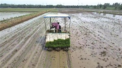 本报6月2日讯 6月1日,在青岛地区最大的稻米种植基地、即墨蓝村青香水稻种植专业合作社的水田里,两台插秧机穿梭忙碌着,将一排排秧苗插进稻田,一派繁忙的耕作景象。记者从蓝村街道了解到,1500多亩蓝村水稻已经开始插秧。