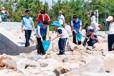 焕新亮相的海之恋公园,风光旖旎环境优美,呈现着人与自然和谐相处的崂山实践:漫步其间,眼前是如茵碧草,身旁是浩渺碧波,头顶是湛蓝天空。活动现场,中国海洋大学环境科学与工程学院2021级大学生志愿者积极宣传环保知识、推介环保理念。志愿者代表辛承烨当天和来自崂山区实验二小的小学生组成最佳搭档,共同开展净滩行动,在寓教于乐中激发小学生探索海洋奥秘的兴趣,培养他们对生态环境问题的科学思考,树立起良好环境保护意识,以最朴实行动表达对青岛碧海蓝天的守护。