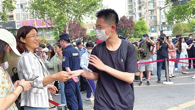 本报6月7日讯 在五十八中考点外,不少其他学校的老师也纷纷赶来为“自家”孩子们加油打气,这是青岛十九中课程与教学管理中心主任徐璟珞第七年送考,他和同事手举“笑傲考场”的牌子,“今年我们十九中共有730多名考生,分布在市区全部考点和即墨区的四个考点。”徐璟珞告诉记者,五十八中考点内他们考生较为集中,共有92名,因此他们一早就赶来这里,给孩子鼓劲。“对坐在考场的他们来说,现在最重要的就是稳定,今早我看我们十九中的考生都非常沉稳,迈着坚定的步伐走进考场,相信他们一定会有个好的发挥!”