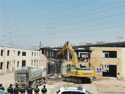 本报6月12日讯 12日上午,在黑龙江路598号院内,崂山区综合行政执法局会同中韩街道办事处组织三台挖掘机和两台洒水车马力全开,对多栋违建楼房进行拆除作业。