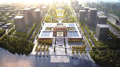 结合城市空间和景观布局,项目采用“合”字造型,以玻璃幕墙为主、竖向格栅为辅。通过柱廊形式表达建筑韵律,以现代建筑手法展现中国传统文化“合”的内涵,形成开放、包容的建筑意向,做到传统与现代建筑理念的有机融合。