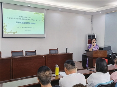 崂山区麦岛小学副校长江宁做全环境立德树人宣讲。 于娜 摄
