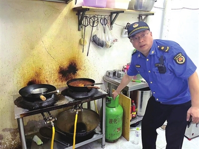 7月7日,李沧区综合行政执法局接到案件移送,在前期的联合安全大检查中,工作人员发现功德坊路一栋高层住宅居民楼下,部分餐饮网点使用瓶装液化气。李沧区综合行政执法局高度重视,责令湘潭路中队立案查处。中队执法人员立刻调查取证,经落实,发现至少三家网点内后厨有瓶装液化气。执法人员立刻约谈了供应瓶装液化气的燃气公司负责人,对方承认了供气的事实。