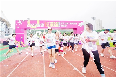 本报7月30日讯 29日上午,“2023国信炫彩跑(青岛站)”在青岛国信体育中心辅助训练场欢乐开跑。炫彩跑是一项集欢乐与运动于一体的新兴跑步运动,被誉为“地球上最欢乐的趣味跑运动”。本次炫彩跑赛道全长约3.5公里,起点位于青岛国信体育中心辅助训练场,中间经过3个站点,最终回到辅助训练场冲刺,跑完全程的参赛者均可获得一枚完赛奖牌。