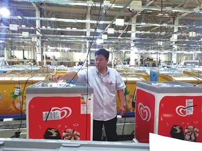 徐伟的设想很快得到了该品牌的肯定,他作为一名售后服务人员也开始参与到产品的研发中。他向记者展示了研发团队的成果,这批定制的冷柜被植入芯片后,可以从后台检测到冷柜的电流、电压、温度等基础数据,并且可以实现通过后台调节冷柜温度。