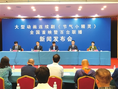 “大型动画连续剧《节气小精灵》全国首映暨百台联播”新闻发布会现场宣传海报。
