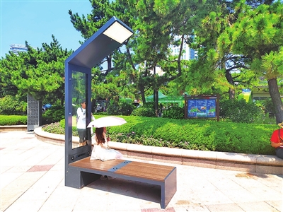 栈桥景区管理服务中心的工作人员告诉记者,为了满足游客的手机充电需求,提升旅游体验,太阳能座椅是今年五一之前安装的,依靠太阳能可持续提供充电电量,供支持无线充电功能的手机随时便捷充电。