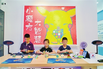 在城阳区青威路的青岛魔米文化竞技魔方馆,一进门,映入眼帘的是一个魔方世界:数百个魔方组成的卡通拼图栩栩如生,形状造型各异的魔方摆满了一面墙,几名学员在老师的带领下进行着魔方练习。其中一位女孩观察手中金字塔魔方三四秒后,按下计时器开始还原,一眨眼的功夫魔方便恢复了原样,仅用时1.9秒,引起全场称赞。另一名男孩则用2.8秒还原了二阶魔方。蒙上眼睛盲拧、单手还原,老师们用更高超的技术向晚报记者展示了魔方的魅力。手指飞快转动,魔方就像被按下了快进键,以肉眼看不见的速度恢复了原样。