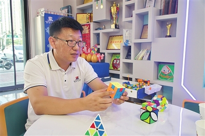 在魔方馆中,琳琅满目的魔方让人眼花缭乱。“魔方可以说有成千上万种,我们教学中会用到30—50种。”二阶、三阶不同层数,金字塔、枫叶、粽子、苹果等不同形状,构造了魔方的千变万化。而每一种开发的思维点都不一样,每一阶段要锻炼的技术也不同。比如初学者可以先从枫叶魔方入手,建立信心,并接触多种魔方,第二个阶段则需要深入研究单种魔方,把速度提升起来,这个阶段需要5—7年,等到“武功”炉火纯青了,就可以尝试盲拧、单手拧等更多“绝学”。