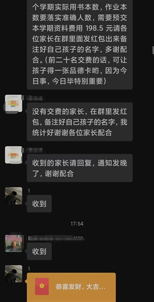 在市民向本报提供的完整群信息截图中看见,16日下午5时许,一名微信名和头像与该班班主任一样的“老师”,在群内发布三条所谓通知,告诉各位家长:“为了预定本(下)个学期实际用书本数,作业本数需要落实准确人数,需要预交本学期资料费用198.5元请各位家长在群里面发红包出来备注好自己孩子的名字,多谢配合。(前二十名交费的话,可让孩子得一张品德卡哟,因为今日事,今日毕特别重要)”