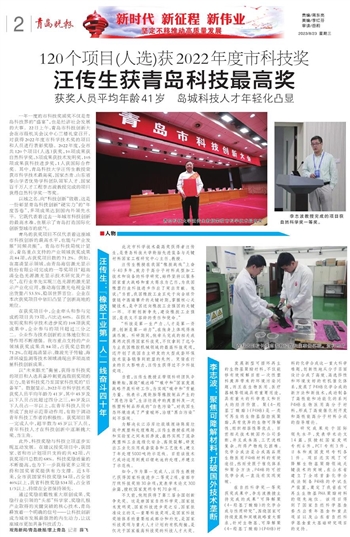 此次市科学技术最高奖获得者汪传生,是青岛科技大学轮胎先进装备与关键材料国家工程研究中心主任、教授。