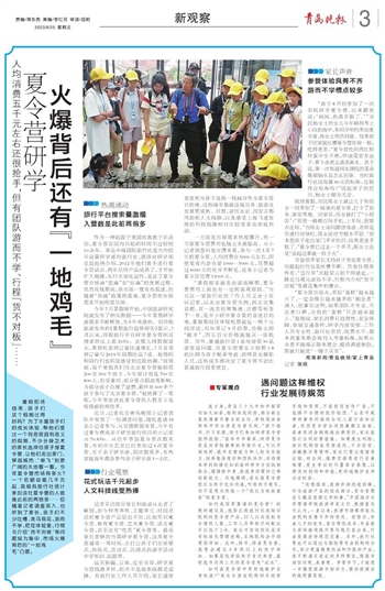 “疫情结束,旅游市场迅速回暖,作为旅游产品的组成部分,夏令营需求火爆是情理之中的事。”中国海洋大学管理学院旅游学系主任、教授董志文认为,一直以来,旅游市场都存在从业机构良莠不齐的情况。疫情后,专业人才的流失、盲目降低成本、专业能力亟待继续提升等问题凸显出来,行业发展亟待规范完善。另外,旅行社等也可以通过与高校等专业机构的合作,设计更富教育内涵和价值的产品,来不断满足家长的多样需求,提高市场信任度、美誉度。多管齐下,才能进一步激发旅游市场活力,推动旅游业的高质量发展。