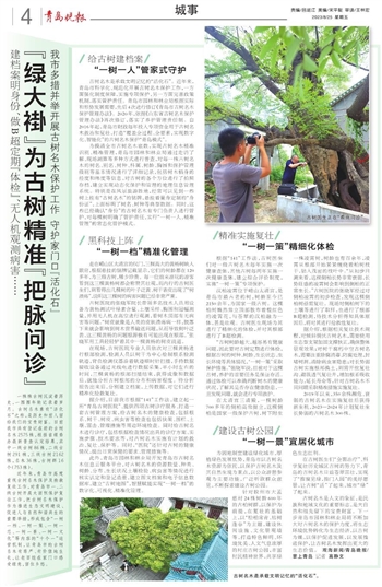 近年来,青岛市高度重视古树名木保护及抢救复壮工作,对青岛市一、二级古树开展大面积保护复壮工作,把古树名木保护作为推进生态文明建设、促进人与自然和谐共生的重要举措,形成包含“一树一档、一树一策、一树一芯、一树一景、一树一文化”等内容的“十个一”运营机制,让青岛市的古树名木有尊严、有价值地生长,让老百姓在家门口感受绿意,留住乡愁。