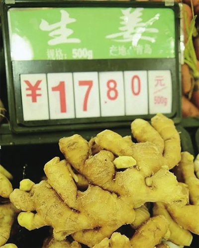除了蒜价猛涨外,姜价也坐上了火箭。抚顺路批发市场蔬菜部负责人周黎明表示,今年1—4月份生姜价格就一直在上涨,带泥的生姜地头收购价格从大约1.6元/斤涨到了4.1元/斤,进入4月中旬,又涨到了6.7元/斤,创下近8年来的新高。这还仅仅是地头收购价格。“到了消费端,一些品质较好的整姜批发价格每斤在10元至14元。”周黎明说,一些地区的生姜零售价已经高达15—18元/斤,这个价格比猪肉都要贵。