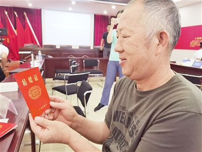 在工作人员的指导下,李忠队一步一步操作,不到一小时,就完成了办证登记的所有流程。在税务办理区,李忠队找资料时拿出了39年前的结婚证。记者注意到,李忠队轻抚自己的结婚证时,脸上洋溢着幸福的微笑。