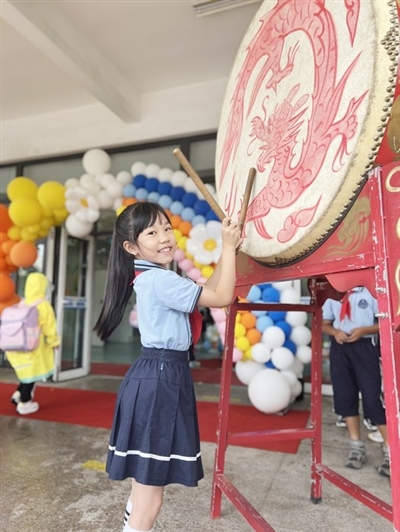 沐金风,杏坛披锦绣;唷清韵,学子谱新篇。崂山区育才学校举办了精彩的报到仪式和开学典礼,一张张崭新的笑脸,一颗颗激动的心灵,将要开启新的篇章。来到校园门口,首先映入学生眼帘的是两面红漆大鼓。举起鼓槌,“咚咚咚”的鼓声在学校的上空回荡,孩子们握紧鼓槌,用尽浑身的力气,擂出奋进的鼓声。