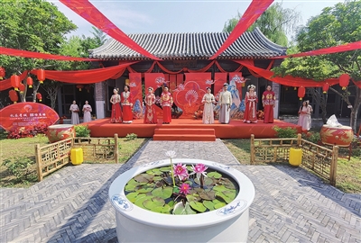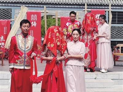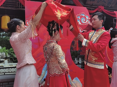 新人们在古色古香的京式四合院里执笔纳吉、妆奁上头、撒轿出阁,在“笙歌迭奏盛世景,纸香墨飞词满江”的华美场景中直观体验传统文化的内涵与魅力,品味中华文化的价值观念、韵味风骨,感受中华文明的“根”与“魂”。