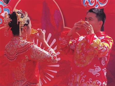 百果山见证,天水为媒,当天上午的世博园北京园内张灯结彩,静待婚礼的到来。大气的中国红贯穿整个会场,大气的中国鼓、精致的木椅等中式婚礼的必备元素遍布场地。上午10时许,鼓乐齐鸣、水袖翩翩,伴着司仪古朴文雅的致礼词,四位新娘凤冠霞帔行出阁礼,祈福暖堂、梳头簪花、盖盖头,新郎则在书写着姓氏的四面旌旗伴护下,手持红绣球,深情款款迎娶新娘。