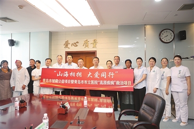 9月3日早,由青岛市红十字会和青岛市市立医院联合启动的“山海相拥,大爱同行——青岛市援藏公益项目暨青岛市市立医院‘高原疾病’救治项目”启动仪式在青岛市市立医院东院举行。启动仪式上,青岛市市立医院党委书记、总院长于腾波表示,“高原疾病”救治项目不仅是一项医疗援助活动,更是一份对藏族同胞的深深关爱和责任担当。医院通过发挥专业优势,为高原常见疾病的防治和治疗贡献一份力量。他希望本次来院的11位藏胞,能够通过医院“手术护理康复一体化”模式的诊疗和精心照护,快速康复,重获健康。青岛市卫生健康委党组成员、副主任邢晓博表示,青岛市市立医院是市属规模最大的三级甲等综合医院,多年来持续派驻技术骨干援助西藏。通过青岛市红十字会和青岛市市立医院联合启动的这项公益救治项目,将青岛市的优质医疗资源输送到西藏,在改善藏区医疗短板、增进藏区民生福祉方面具有非常重要的意义,市卫生健康委也必将做好各项支持保障工作。青岛市红十字会党组书记、常务副会长高嵘表示,青岛市市立医院作为红十字会冠名的医疗机构,勇于践行援藏精神,努力发挥自身的医疗技术优势,针对农牧区群众生产生活的情况和现实需要,联合发起了高原疾病救治公益项目,真正援到了百姓的心坎上,暖到了百姓的心窝里,使藏区的民众直接受益、长期受益,是一项民心工程,体现了青岛市市立医院的情怀担当,也彰显了人道、博爱、奉献的红十字会精神。