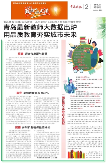 9月10日,青岛18.09万名教师将迎来第39个教师节。这是属于教师这个神圣职业的荣光,也是我们盛情感念师恩的时刻。国将兴,必贵师而重傅。近年来,青岛高度重视教师队伍建设,按照《关于全面推进中小学教师队伍梯队发展的意见》:到2024年,青岛“教育名家”达到百人以上,青岛名师、名校长、名班主任数以千计,市级骨干教师数以万计。在基础教育优质资源倍增的背景下,青岛的教师队伍正在不断自我提升、发展壮大。优秀的教师将点亮莘莘学子求知的火种,夯实城市发展的未来。