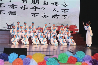 学校注重书香氛围打造,楼道内“精雕细镂”,书香墙、墨香墙、图书吧……处处彰显着国学精粹的光芒:墙壁上的“五常”释义,阐释着传统文化的内涵;《三字经》《千字文》为国学启蒙奠定基础;《论语》节选感悟“尊师重教”的可贵。“人人诵国学,时时诵国学”在校园蔚然成风,教室内的图书角更是琳琅满目。阅读之美渗透在校园每一隅。