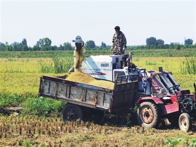 当天上午10时许,记者在二里村的青香水稻种植专业合作社田地中看见,一台收割机正在稻田里来回穿梭,像有神力的巨人一样,将麦穗从田间地头“收”进三轮车车斗里。