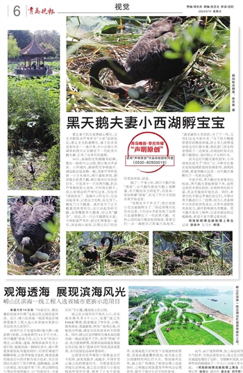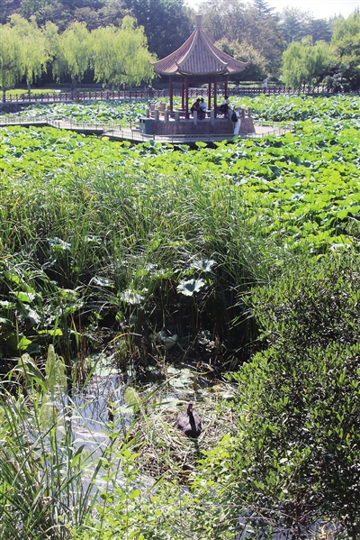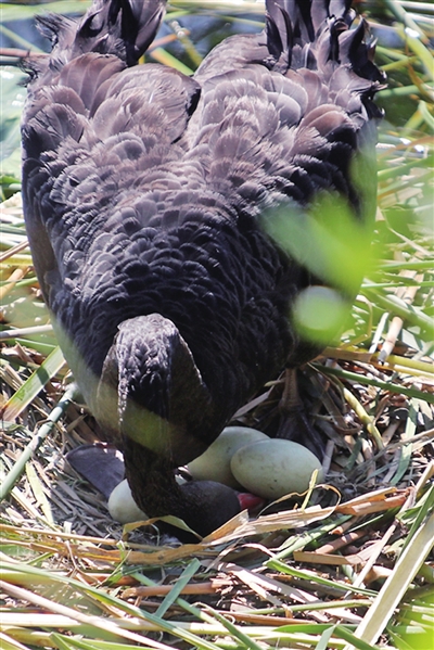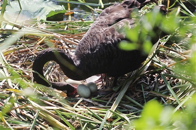 14日,岛城阳光明媚微风轻拂,整治一新的中山公园,吸引着众多游客。小西湖内,满湖荷花争相盛开。湖边临近延安路一侧,茂密芦苇环抱着一小方水域内,两只通体黑亮、脖颈修长的黑天鹅,吸引着来往市民的目光。只见其中一只母黑天鹅,趴在芦苇堆积的小窝里,不时伸长脖子,将小窝周边的芦苇叼过来,为住所“添砖加瓦”。每隔半小时左右,它会站起身来,记者这才发现,在它身下,躺在三只天鹅蛋。或许是为了让天鹅蛋受热更均匀,这只站起身的天鹅,会用嘴拨弄天鹅蛋,好让其“翻身”。旁边,另一只公天鹅漂在水里,不停衔着芦苇杆,把它们聚集到一起后,再送到小窝旁,以便让自己的住所更加牢固、舒适。