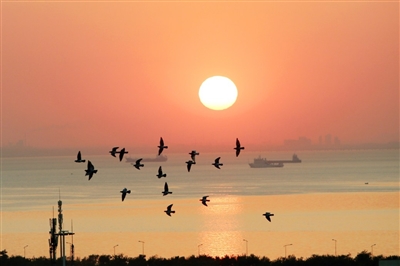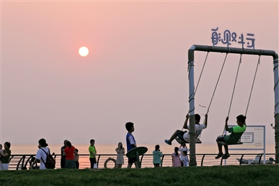 每天傍晚时刻,便会有众多市民和游客专程来到欢乐滨海城海边,感受夕阳之美。人们有的凭栏远望拍照留念,有的坐上台阶静心品味,有的漫步海滨享受海风。伴随着夕阳西下,蓝色的大海被一轮红日渐渐染成了橘色。夕阳下的海面波光粼粼、荡人心扉,偶有几只海鸥飞过,天地间重现王勃笔下“落霞与孤鹜齐飞、秋水共长天一色”的美景。