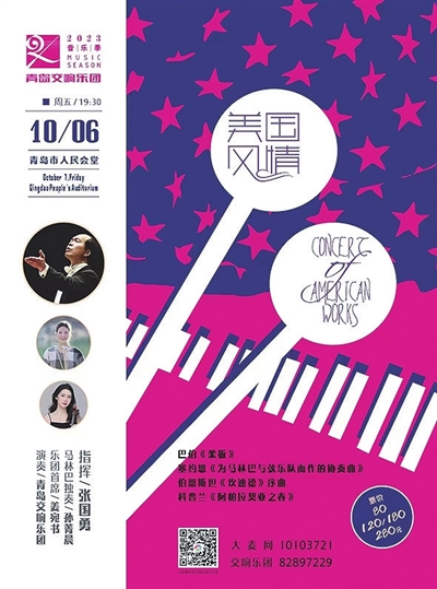 10月6日《美国风情音乐会》将在人民会堂奏响。张国勇担任本场音乐会指挥,马林巴独奏孙菁晨。青交在这场音乐会上将演奏巴伯《柔板》、塞约恩《为马林巴与弦乐队而作的协奏曲》、伯恩斯坦《坎迪德》序曲、科普兰《阿帕拉契亚之春》等曲目。