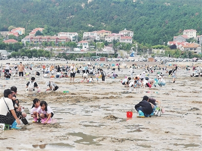 在会场赶海园,记者还遇到了一位捉蛏高手。“运气好,碰到蛏子窝,一次潮水能挖七八斤,运气差点也能挖四五斤。按比市场价稍低的30元一斤的价格算,收入还可以。靠这个发家致富有点难,但是靠海吃海,十分靠谱。”这位头包方巾的捉蛏高手就住在崂山区,多年积攒的赶海经验让她早已练就了眼疾手快的好身手,不一会就挖出了十来只蛏子,吸引了周围游客前来围观。