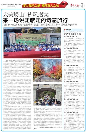“秋韵崂山”六大精品旅游路线包括“合家欢”亲子之旅、“问道崂山”文化之旅、“海誓山盟”浪漫之旅、“世外桃源”田园之旅、“醉美海滩”踏浪之旅、“仙境海岸”漫步之旅。这是崂山区首次推出季节性精品旅游路线,亲子合欢、文化博览、邂逅浪漫、田园采摘、海滩踏浪、滨海漫步,适合市民和游客在秋风送爽的季节,来一场说走就走的诗意旅行。