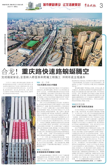 “一天一个样,每天清晨起床都有惊喜。”家住重庆路附近的市民周女士告诉记者,重庆路快速路工程开工以来,每天清晨出门都能看到不一样的景象,站在其所住高层俯瞰,一条长龙拔地而起,蜿蜒着向前方延展。“开通的脚步越来越近了,以后出门就更顺畅了。”