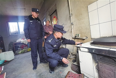 北宅派出所社区民警张宏辉走访到书院村时,停下车给网格员打了个电话。张宏辉负责书院村等五个乡村社区,对辖区情况非常熟悉。近期寒潮来袭,他一直牵挂着居民的取暖安全。“一部分居民用上了气暖,但还有300多户居民在家都是靠烧柴取暖。”张宏辉称,虽然派出所民警、社区工作人员和网格员都张贴了防范告知书,但他总是觉得,只有到居民家里看一看炉子,才能真正放心。