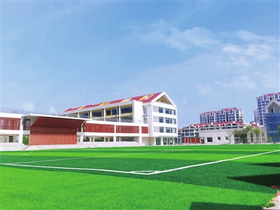 在青岛市全面推进基础教育优质资源倍增、实施新校高位发展行动的背景下,今年秋天,全市共有40多所新建中小学投入使用,高标准建设的专用教室、学术报告厅、标准化食堂几乎成了各所学校的“标配”。位于敦化路北侧、永吉路西侧的青岛中央商务区实验学校(以下简称“中实校”)就是其中之一。走进校园,放眼望去,以红、白、灰为主色调的教学楼大气磅礴又富有时尚气息,建筑两侧外立面增添了大面积的黄、绿色块,更显活泼亮眼;300米标准塑胶跑道围绕着足球场,连接着篮球场和排球场,跃动着青春的气息。