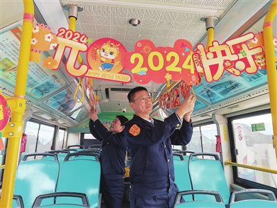为迎接新年的到来,304路线QD001号驾驶员王勇与乘务员冯朝梅将十米车厢装扮成“迎元旦 中国红”主题车厢,让市民在新年初始喜迎新气象。走进车厢,处处营造着浓浓喜庆祥和氛围,给严寒天气增添了一丝丝暖意。车厢两侧玻璃上张贴有新年快乐、年年有余等精致祝福贴纸,栏杆处悬挂着各式各样的新年祝福装饰品以及拉旗挂饰。