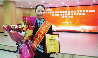 来自中国铁路济南局集团有限公司青岛客运段的黄兰鑫,是一名普通的列车乘务员。捐献成功后,她将成为青岛市第184例、李沧区第15例、2024年青岛市首例造血干细胞捐献者。