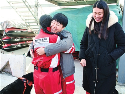 “回来了,回来了!”1月3日上午,早早就在基地门口等待的队员们看到远处熟悉的救援车辆,激动地喊起来。“欢迎回家!”“好样的。”没有太多的仪式,车辆停下后,赴甘肃的队员与队友激动拥抱。基地的两条搜救犬看到队员们归来,也高兴地摇着尾巴。