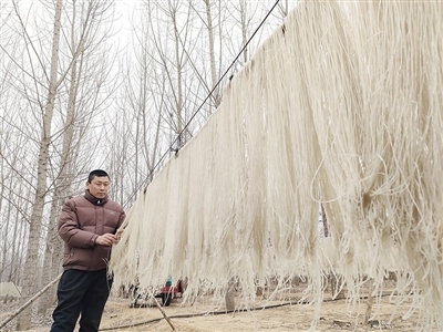 “眼下,随着春节临近,纯手工粉条成为畅销的‘年货’,在为各地市民增添餐桌美味的同时,传统粉条变成冬闲增收的‘金条’。”相武说,村民们制作粉条坚持的是古法,传承的是浓浓“乡愁”,大相家粉条已经成为洋河镇一张响亮的名片。他希望村里的年轻人将这项技术传承下去,利用学到的知识,在继承老手艺的基础上,再闯出一片新天地。