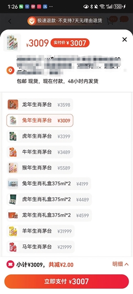 “龙茅”的火爆也带火了茅台往年推出的生肖酒。一家名为老酒文化馆的商家上架了龙、兔、虎、牛、猴、羊、马等茅台生肖酒,其中羊年生肖茅台售价高达31999元,马年生肖茅台售价达21999元。该商家在产品描述中特别说明了服务保障,所有货品将采用现货直发,顺丰速运,一瓶一码,溯源保真,保价7天,售后无忧。