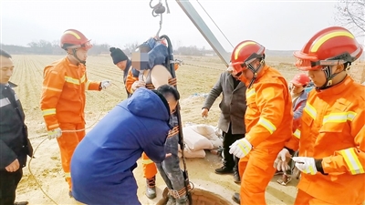 救援人员观察后发现,井口直径约0.9米,深约7米。井底的救援人员与医护人员商量后,决定将伤者移动到担架上,再用板带将人和担架固定在一起,由井上的救援人员放下挂钩,合力将人拉上去。