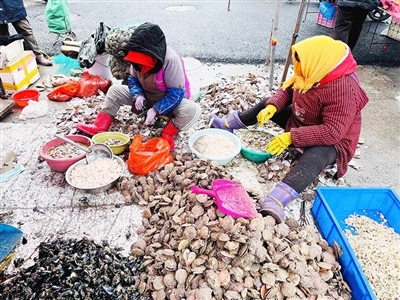 50岁市民万志刚在沙子口长年开海鲜店,卖当地精品海鲜。早些年,他曾把多种精品海鲜带到大集上销售,后来发现赶集的市民最认扇贝,所以近几年他只运扇贝到集上。“我们和沙子口大集结缘十年了,只来这一个集。我平时主要在店里,媳妇到大集上,一次带150公斤扇贝,90元一公斤的扇贝肉,现场剥壳,绝对新鲜。”万志刚的妻子杜昌华风雪无阻,每次带来的扇贝都悉数售空。