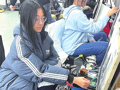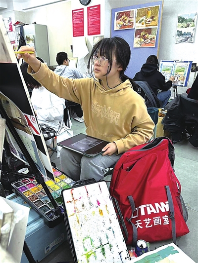 高一时, 王同学将大部分时间放在夯实高中文化课基础上,在每周两天的美术课以及周末在画室里学画;到了高二,文化课和绘画的学习时间成了五五开,长假都用来学画画;进入高三,她计划美术统考、校考结束后,再专心冲刺文化课。如今,她已经过了央美初试,正在准备央美、国美的复试和清华美院的初试,目标是央美设计专业。王同学坦言,顶尖美院的校考让自己真正感受到压力,因为考题难度高、灵活性比较大,而且高手特别多,竞争相当激烈。