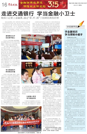 说起金融理财,很多人都觉得门道很多,内容挺高深,其实很多知识深入浅出,孩子学了也大有裨益。从小对金钱有所了解,及早树立理财意识,更是可以帮助孩子更好学会规划。3月3日,青岛晚报小记者走进了交通银行青岛分行,工作人员为他们上了一节生动的金融课,什么是消费者八大权益?如何保护自己的合法权益?新版人民币有什么不同?大家积极举手回答问题,受益匪浅。