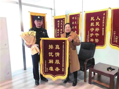 3月9日,张女士将一面印有“真情服务,排忧解难”的锦旗和两束鲜花送至机场“暖阳警务室”,感谢民警帮助她欲离家出走的女儿。3月17日,航站楼派出所收到王女士送来的一面锦旗,锦旗写着“长得帅,办案快”,感谢辅警方建文竭尽全力帮助其解决困难……在这里,他们还有一个特别的身份,都是机场公安“暖阳警务室”的一员。以第三届青岛最美人民警察段阳同志命名的“暖阳警务室”在机场航站楼里熠熠生辉。这里有负责接处警的民警,也有负责帮助查找丢失行李的辅警。从凌晨5时第一个航班起飞,到第二日凌晨3时最后一班乘客平安离港,他们始终坚守青岛胶东国际机场的每一个日夜。