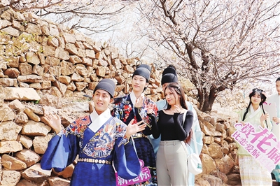 昨天上午,记者在现场看到,大崂樱桃谷中洋溢着活力与激情,粉白花海漫山遍野,微风拂过暗香浮动。身穿精致汉服的传统文化展示队伍穿梭于花海间,手举打卡标语,更添古色古香的氛围感。开幕首日,已有不少市民和游客慕名前来,与亲朋好友相约樱桃花下,一探满树繁花的盛景,用相机记录下美好的瞬间。